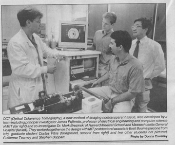 ). The first TD-OCT imaging catheter and system was commercialized by LightLab Imaging, Inc., formed in 1997 by Prof. Fujimoto, Mr. Swanson, and Dr. Brezinski. In 2001, Dr. Brezinski developed index matching to allow imaging through blood (https://doi.org/10.1161/01.CIR.103.15.1999). Intracoronary imaging in humans was achieve in 2003 by the Tearney and Bouma group (doi:10.1136/heart.89.3.317). Dr. Brezinski and Professor Fujimoto could not pursue in vivo human imaging because of COI. OCT systems began selling significantly in 2007. Lightlab Imaging is now owned by Abbott labs who has run double blind prospective trials showing morbidity and mortality benefits (DOI: 10.1056/NEJMoa2307770). "Among patients with complex coronary-artery bifurcation lesions, OCT-guided PCI was associated with a lower incidence of MACE at 2 years than angiography-guided PCI." A list of studies can be found on the Abbott web site. The only significant differences between the original LightLab system and those used in the clinical trials, besides using SS-OCT, is a rapid catheter attachment system to the OCT engine. Many advances which have been developed since 2000 which have not been incorporate in vivo by clinicians or in clinical trials. This includes PS-OCT, OCT elastography, and an OCT guidewire. Since 1993, he has advanced OCT through basic science, engineering, clinical trials, quantum physics, and classical physics. His major areas of OCT research are cardiology, osteoarthritis, quantum field theory of OCT, and adjuvant OCT techniques (PS-OCT, elastography, second order correlation spectroscopy).